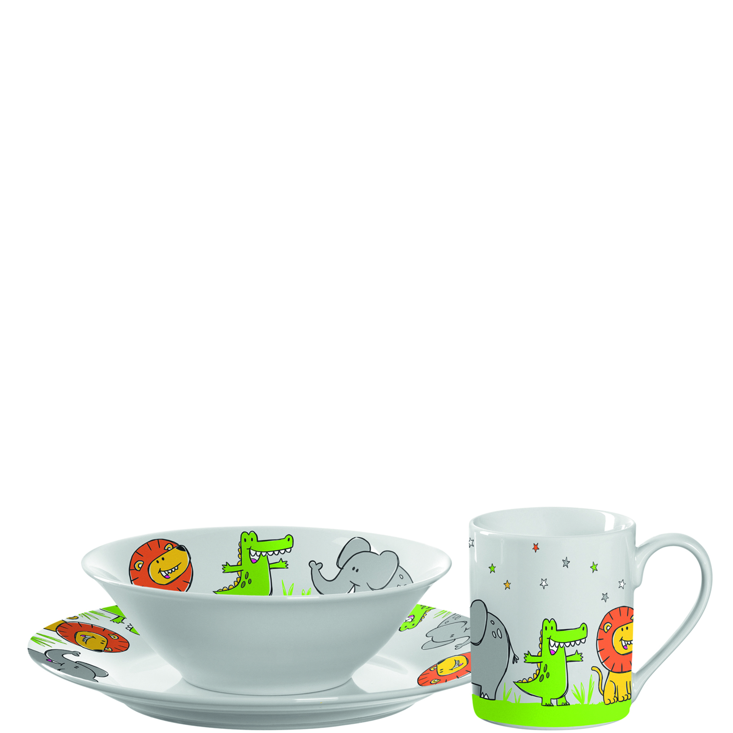 AusführungMaterial: KunststoffFarbe: blau, gelb, rot Farbmixbestehend aus: Teller flach, Schüssel, Becher, Gabel und LöffelLieferumfang1 Geschirrset in Geschenkverpackung