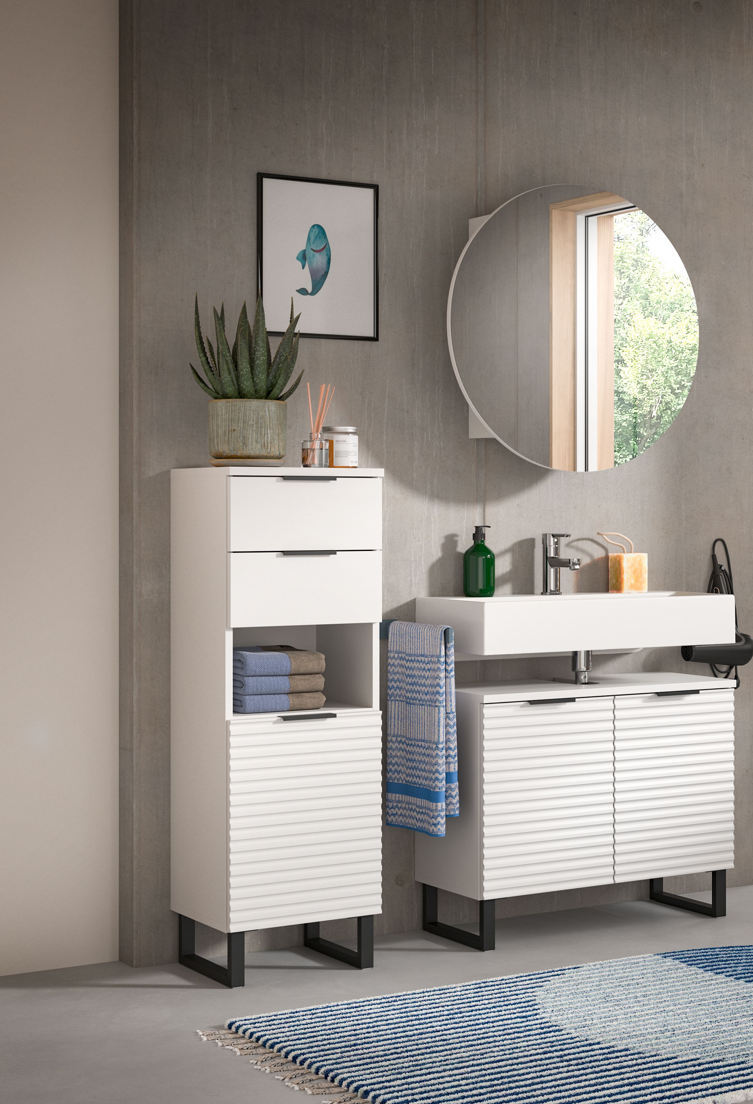 1 Badkommode mit 1 Tür, 1 Einlegeboden, 1 Konstruktionsboden, 2 Schubkästen und 1 offenem Fach