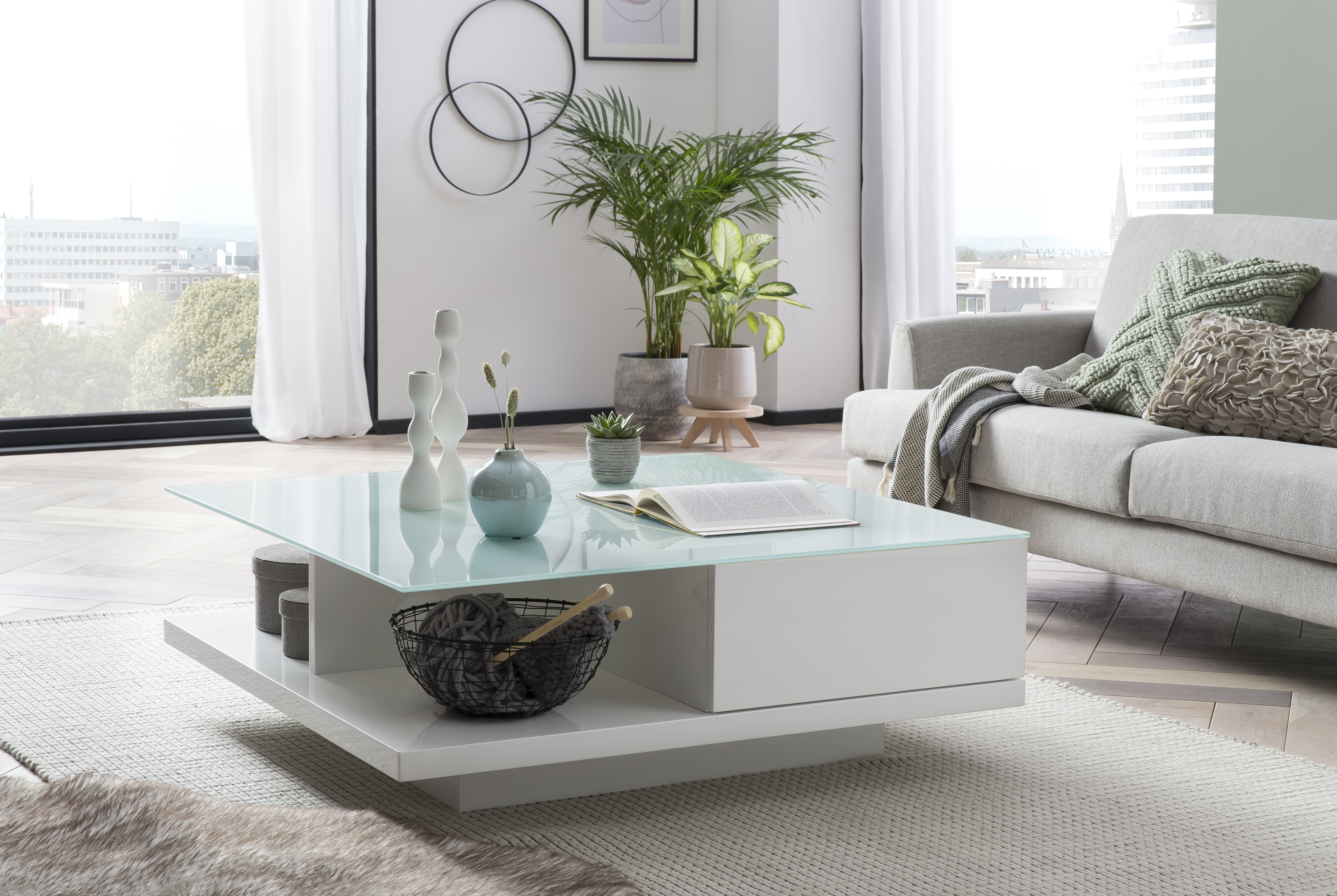 Tischplatte: Kristallglas gehärtet, Glasplatte von unten weiß lackiert