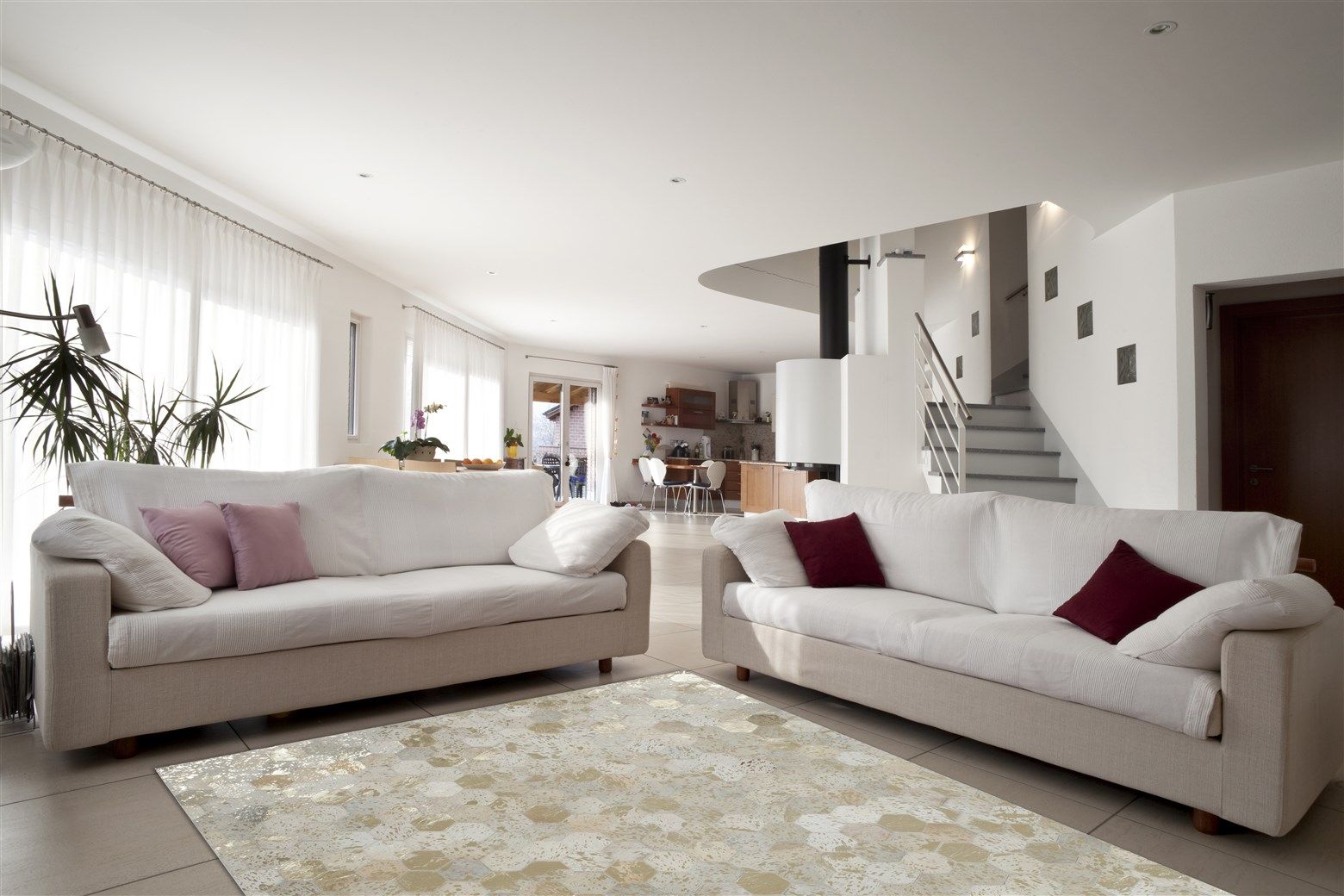 Der wunderschöne Lederteppich mit eingearbeiteten Applikationen aus metallischer Folie rundet jeden edlen Einrichtungsstil gekonnt ab. Der hochwertige Edel-Teppich aus 100 % Leder überträgt einen individuellen Touch auf seine Umgebung und erzeugt ein ganz besonderes Flair. Von Hand gefertigt ist jeder einzelne Lederteppich ein Unikat. Die Verwendung von edlen Naturmaterialien und die hochwertige Verarbeitung sorgen für ein dynamisches Aussehen und machen jeden Teppich einzigartig, denn bei Naturprodukten kann es in Form, Farbe und Muster zu Abweichungen von bis zu 30 % kommen. Das natürliche Fell kann nach einiger Zeit und bei hoher Beanspruchung gegebenenfalls an Haaren verlieren. Ebenso könnte sich die Metallicfolie unter Umständen ablösen. Dies ist dem Naturprodukt und der Beschaffenheit des Fells geschuldet und kein Produktionsfehler.