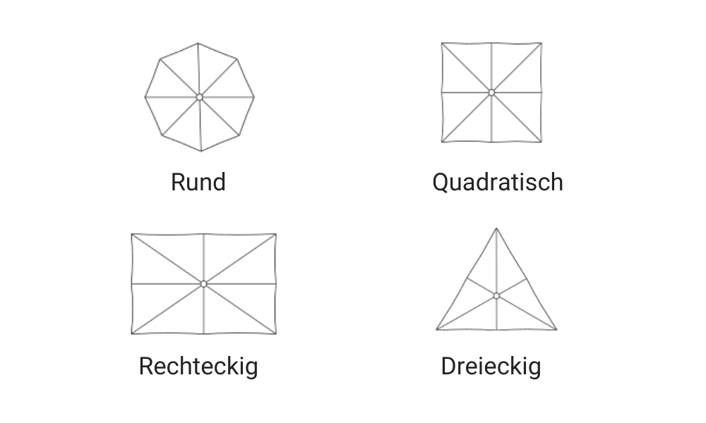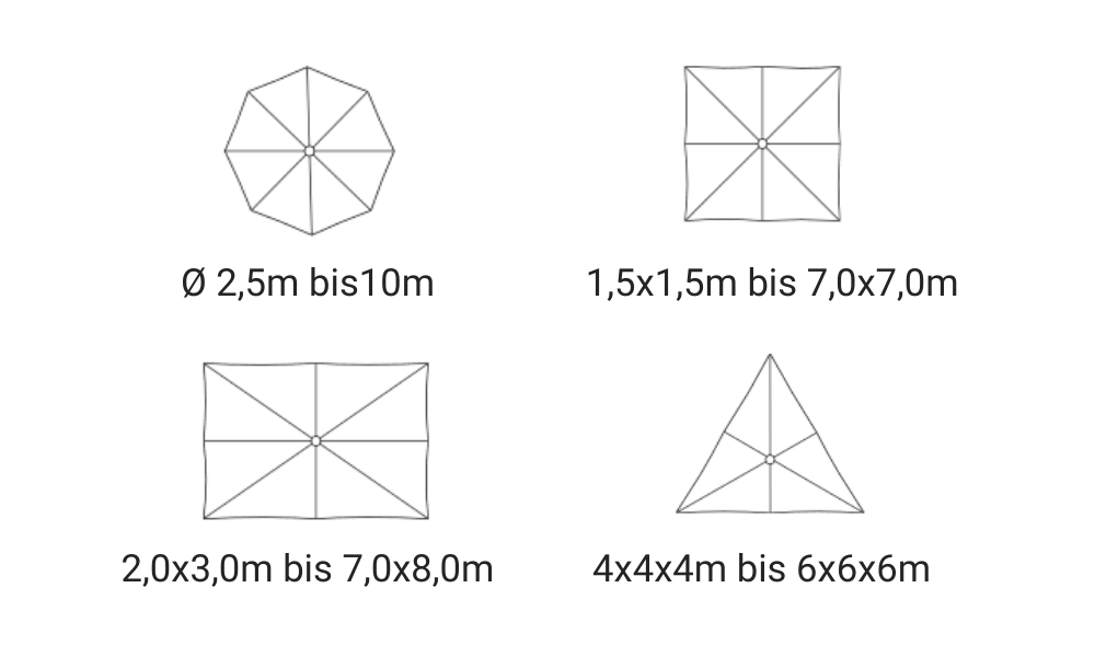 Klassisch rund oder quadratisch, großflächig rechteckig oder außergewöhnlich dreieckig. Die Sonnenschirme von May sind in 4 Formen erhältlich.