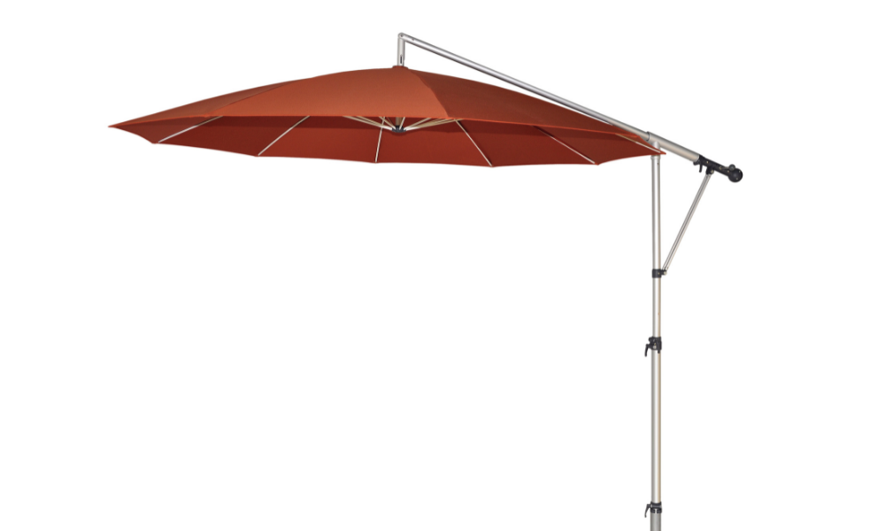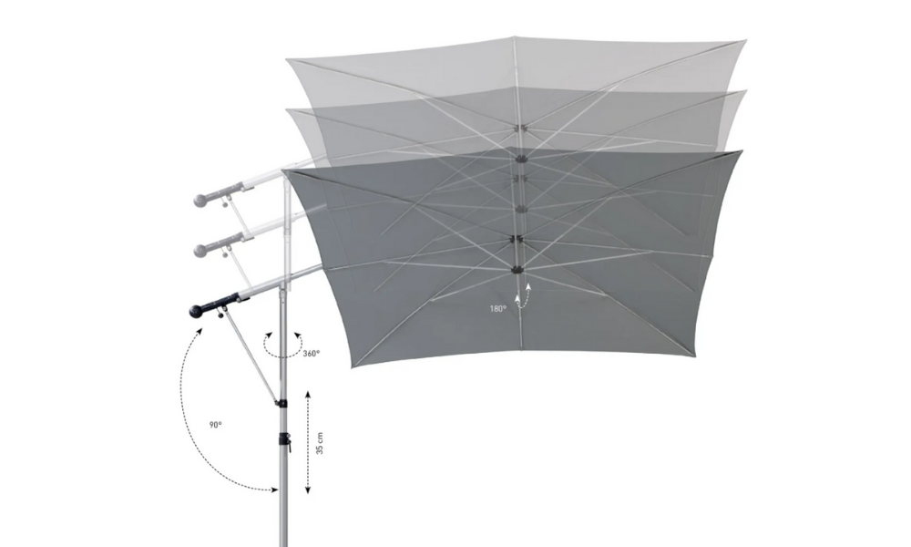 Die praktische Schirmdach-Fixierung des MEZZO ermöglicht das Öffnen des Schirms in Schräg-Positionen und stoppt das Pendeln des Schirmdaches im Wind. Die Bedienung, z.B. das Öffnen und Schließen des Gartenschirms per Handkurbel oder die individuelle Schrägstellung, ist ergonomisch und bequem.