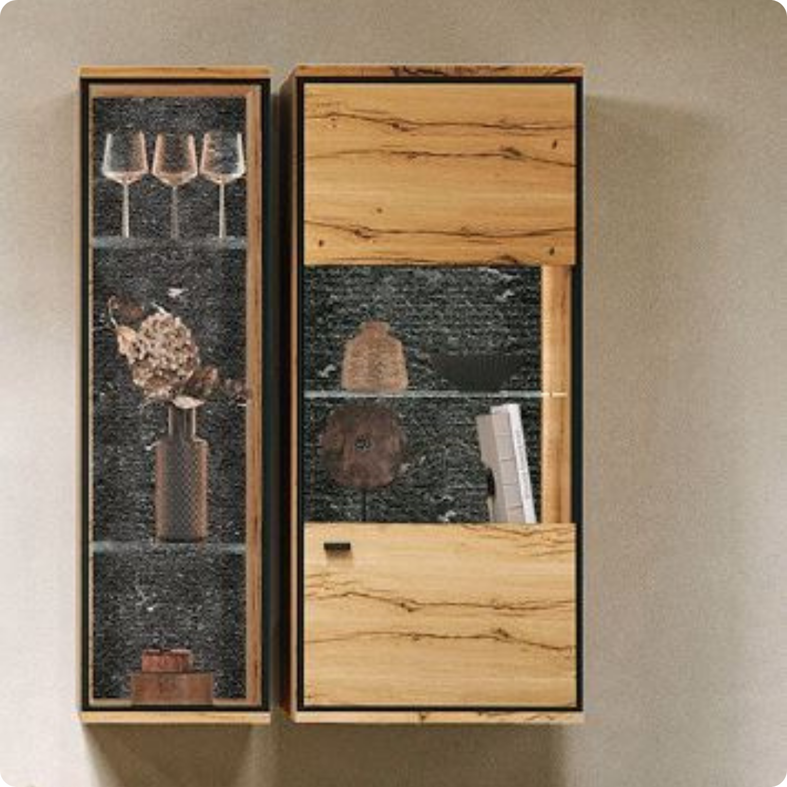 Front und Korpus Salzkammergut Alteiche natur gebürstet furniert, Absetzungen Kristallgranit Schubkasten-Vorderstücke/Rückwände Eiche massiv geschroppt, ca. 284x196x38-55 cm.