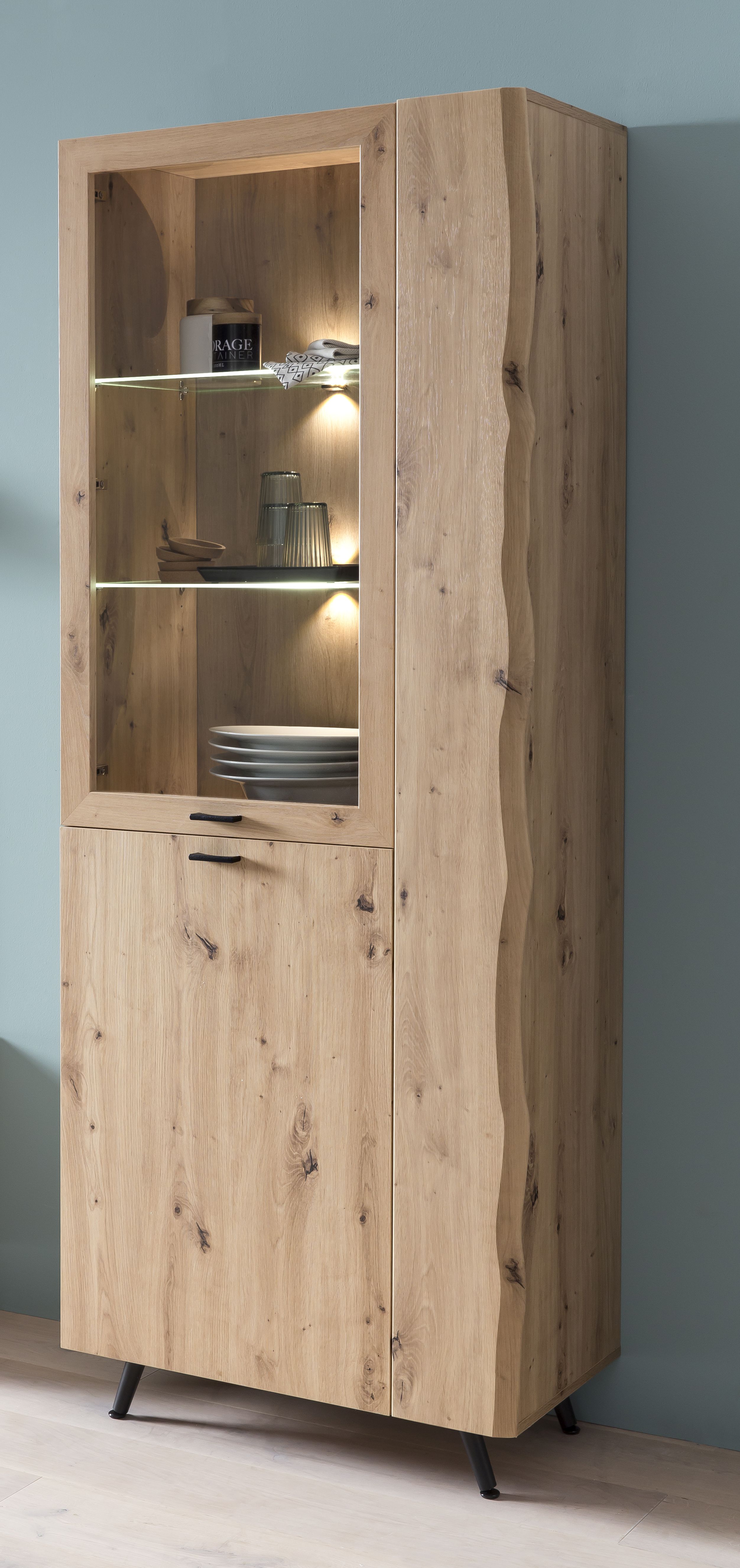 AusführungFront: Artisan Eiche Holznachbildung, MDF (Mitteldichte Holzfaserplatte) foliert mit Absetzungen in Schwarz (Spanplatte Melaminbeschichtung) / GlasKorpus: Artisan Eiche Holznachbildung, Spanplatte MelaminbeschichtungFüße: Kunststoffgleiter in schwarzGriffe: Metall in schwarzAusstattung2 Türen, davon 1 Tür mit TeilverglasungTüren mit Softclose4 verstellbare Einlegeböden2 Glasböden3 Konstruktionsbödeninklusive Beleuchtung Lieferumfang1 Vitrineohne Dekoration / weitere Möbel