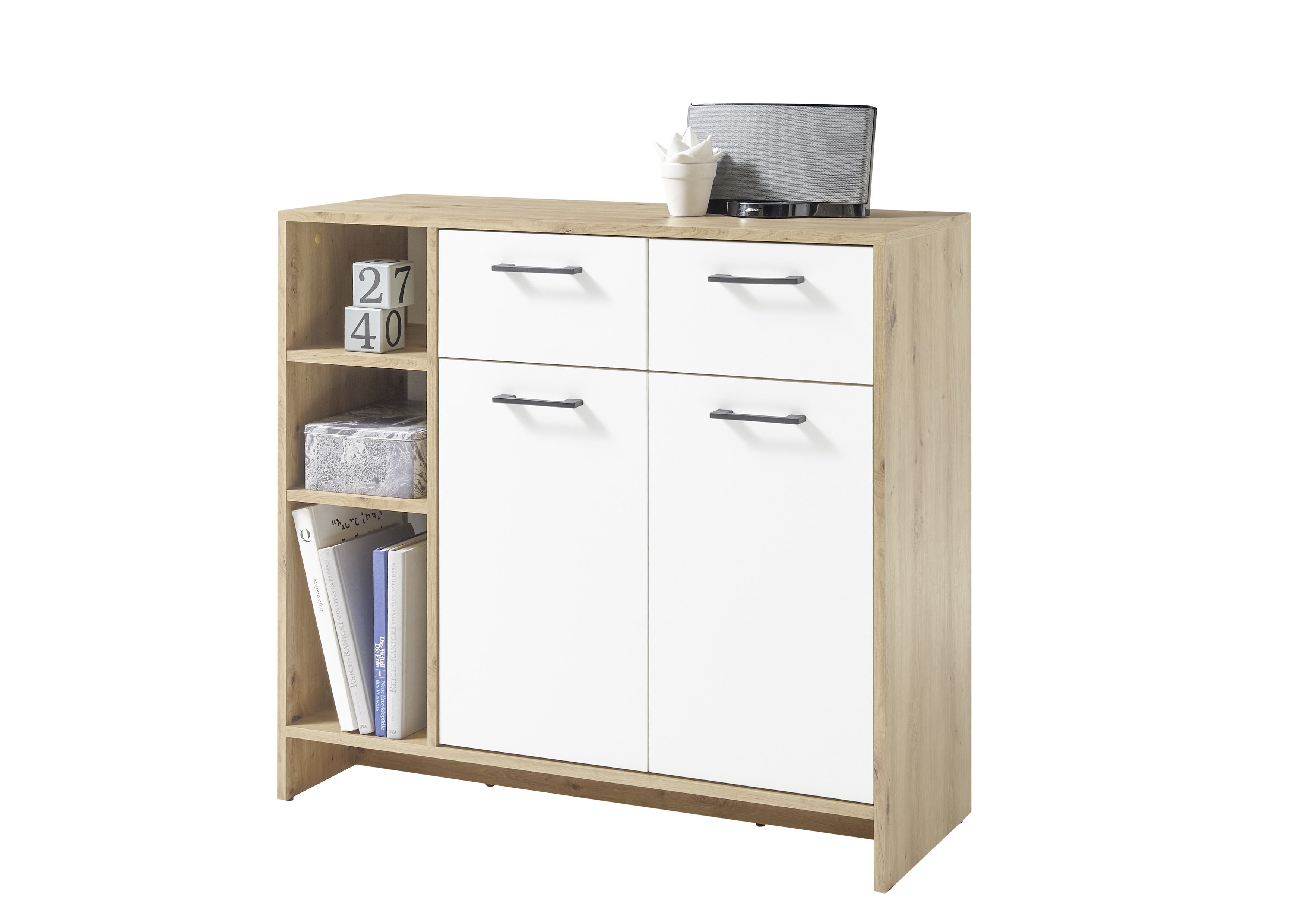 AusführungKorpus: Artisan Eiche Holznachbildung (D78)Front: Weiß (120)Griffe: Kunststoff in AluoptikAusstattung2 Türen1 Einlegeboden2 Schubkästen auf MetalllaufleistenLieferumfang1 Kommodeohne Dekoration / weitere Möbel