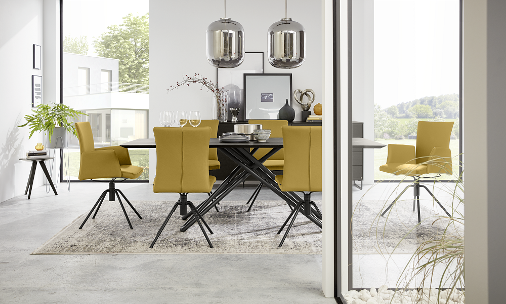 Wähle einen modernen Esszimmertisch in Hochglanz-Optik oder aus einer Holz-Metall-Kombination. Hochglanzmodelle mit schmalen, weißen Kufenbeinen passen besonders gut zu dem eleganten Look. Um den Tisch stellst du Kunststoffstühle mit einem Chromgestell in Schwarz und Weiß. Für etwas Frische und Leichtigkeit sorgen Grünpflanzen auf dem Boden oder in einer Glasvase auf dem Tisch. Dekoriere den Tisch außerdem mit schlichten, geraden Kerzenständern. An die Wände hängst du kontraststarke Bilder oder geradlinige Wandkerzenhalter, und für angenehmes Licht sorgt eine Hängelampe im modernen Design.