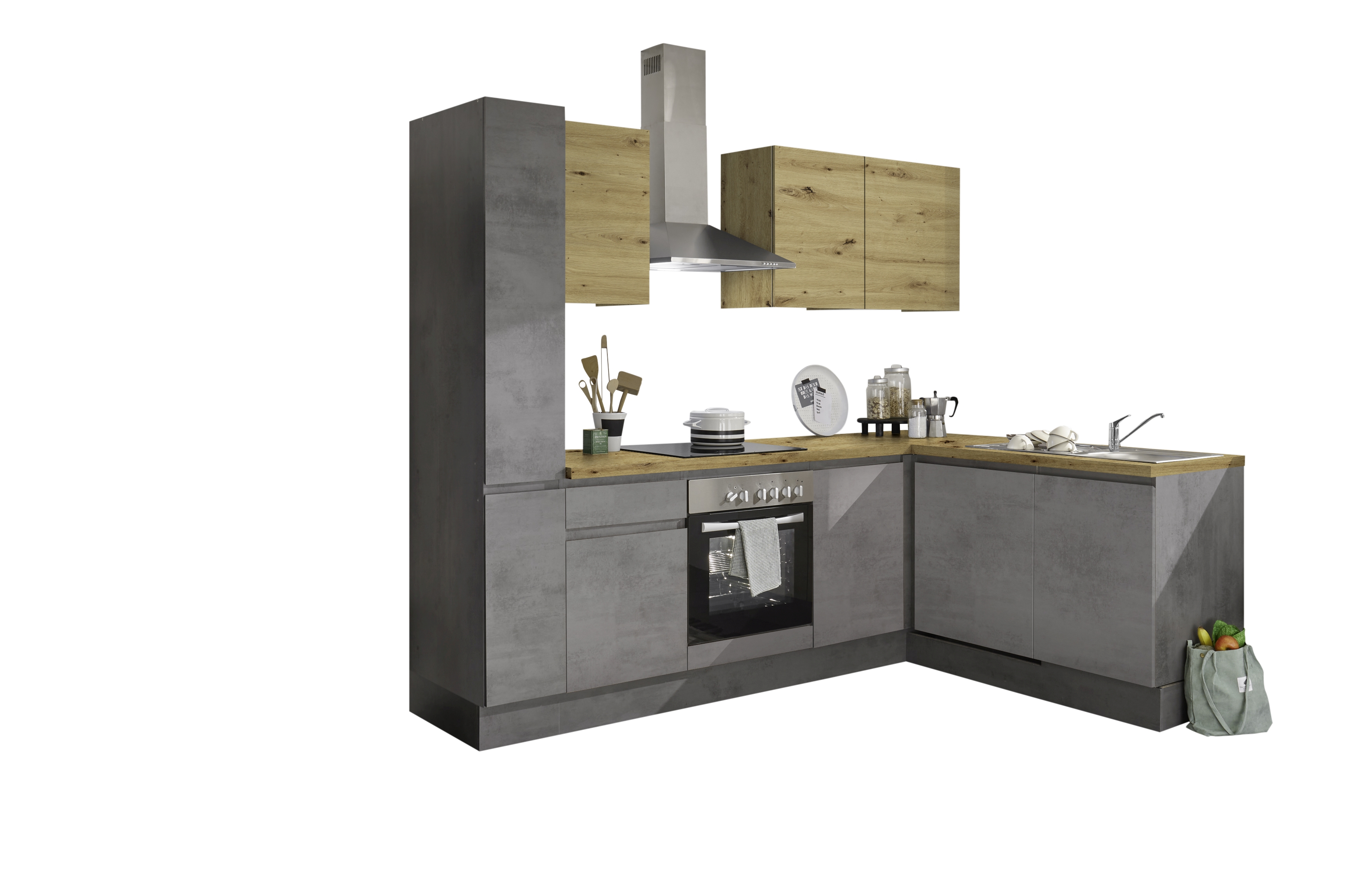 AusführungFronten: Eiche HolznachbildungKorpus: Eiche HolznachbildungMaterial: Spanplatte foliert / Melamin beschichtetAbsetzungen, Oberplatte: 151 Beton Optik dunkelGriffe: Aluminium in schwarz lackiertAusstattungKüchenblock1 Hängeschrank mit 1 Tür, dahinter 2 Fächer1 Hängeschrank mit 2 Türen, dahinter 2 durchgehende Fächer1 Unterschrank mit 3 Schubkästen1 Unterschrank mit 2 Türen, dahinter 2 durchgehende Fächer1 Unterschrank passend für alle marktüblichen Herde/BacköfeBuffetOben links: 1 Tür, dahinter 3 FächerOben rechts: 3 offene Fächer, mit Kabeldurchlass in der OberplatteUnten links: 1 Schubkasten, darunter 1 Tür, dahinter 2 FächerUnten rechts: 1 offenes Fach, darunter 1 großer SchubkastenLieferumfang1 Küchenblock mit Buffetohne Dekoration