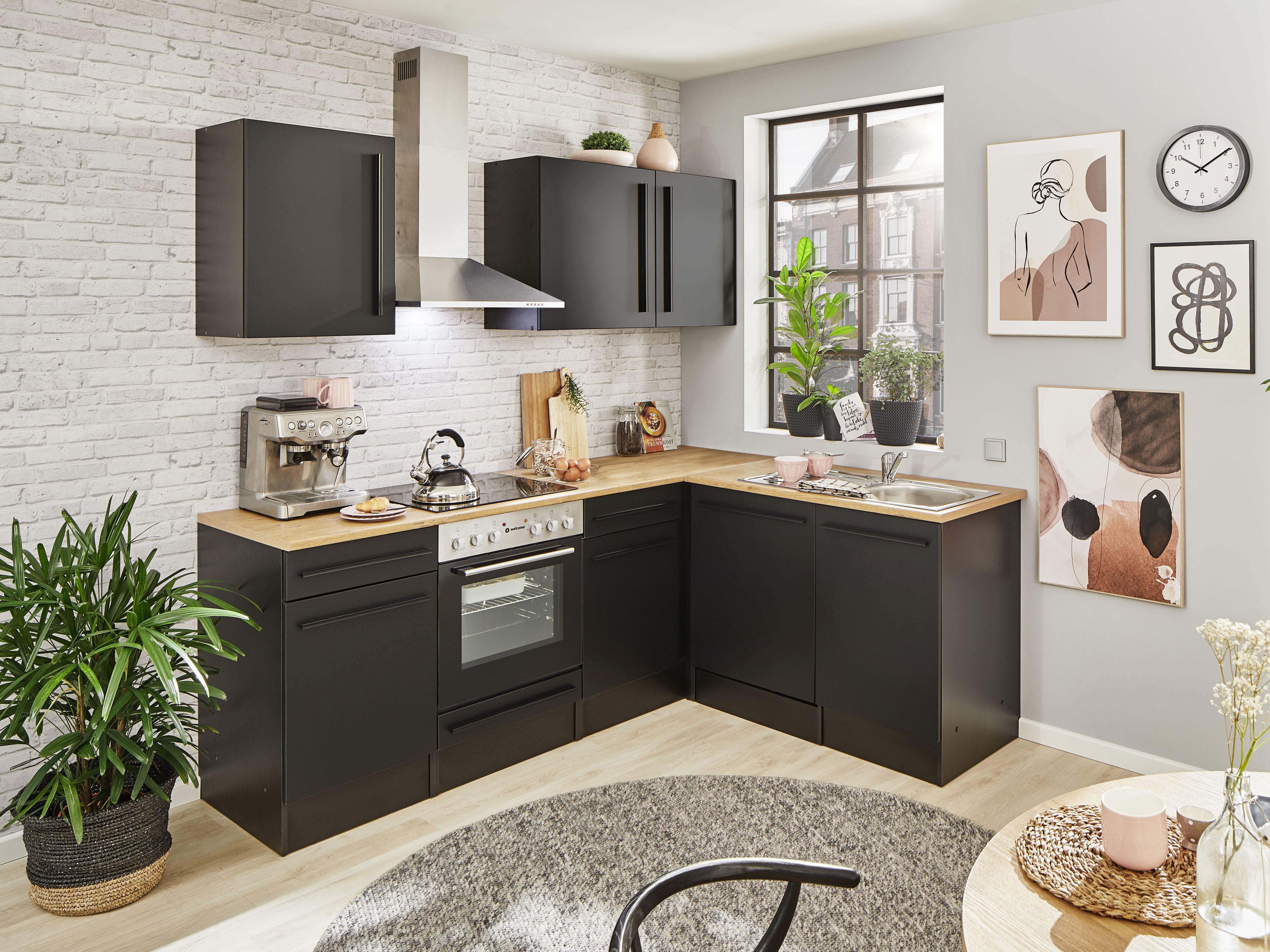 AusführungFront: Schwarz matt MDF (Mitteldichte Holzfaserplatte) tiefziehKorpus: Schwarz matt (Spanplatte foliert)Arbeitsplatte: Lanzelot Eiche HolznachbildungGriffe: Kunststoff in schwarz mattAusstattungKüchenblock1 Unterschrank mit 1 Schubkasten (System mit Unterführung), 1 Tür und 1 Einlegeboden1 Herdumbauschrank mit 1 Klappe1 Spülenunterschrank mit 1 Tür1 Eckunterschrank mit 1 Schubkasten (System mit Unterführung) und 1 Tür2 kleine Hängeschränke mit jeweils 1 Tür und 1 Einlegeboden1 Hängeschrank mit 1 Tür und 1 Einlegeboden1 große Arbeitsplatte1 kleine Arbeitsplatteinklusive Türblende für integrierten Geschirrspülerinklusive Sockel