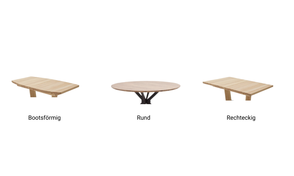 Tischplattenformen auch in bootsform, rund, rechteckig erhältlich.