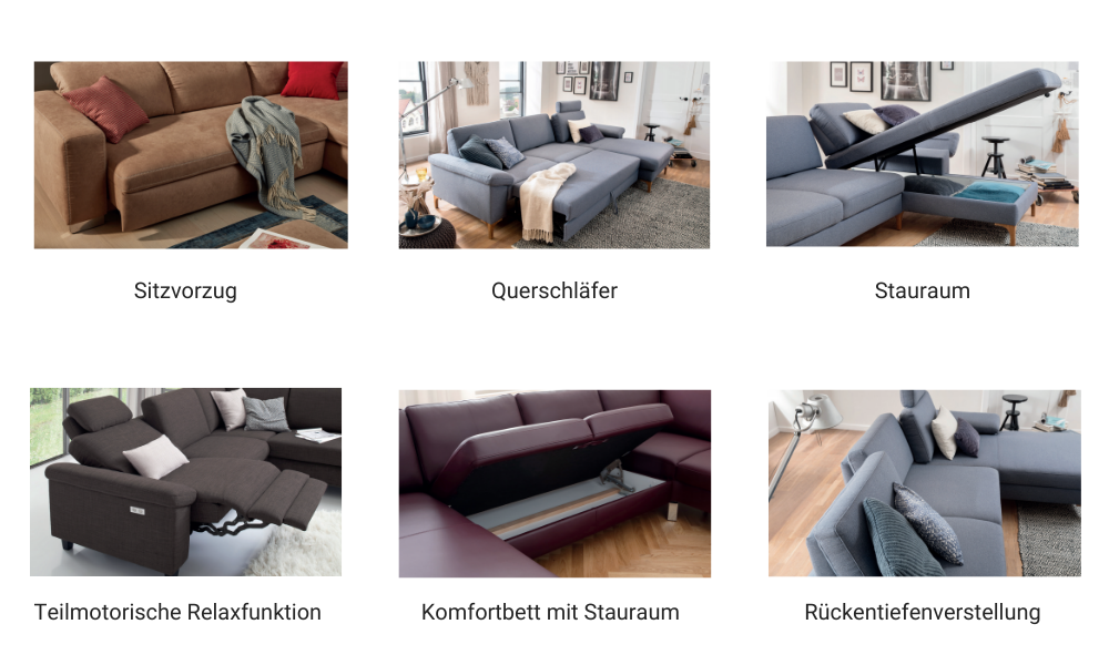 Ob Sitztiefenverstellung, motorische/teilmotorische Relaxfunktion, jede Menge Stauraummöglichkeiten oder eine Bettfunktion. Hier haben Sie eine große Auswahl an verschiedenster Funktionen.