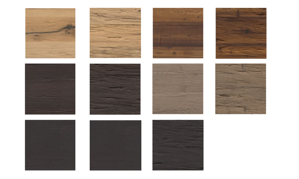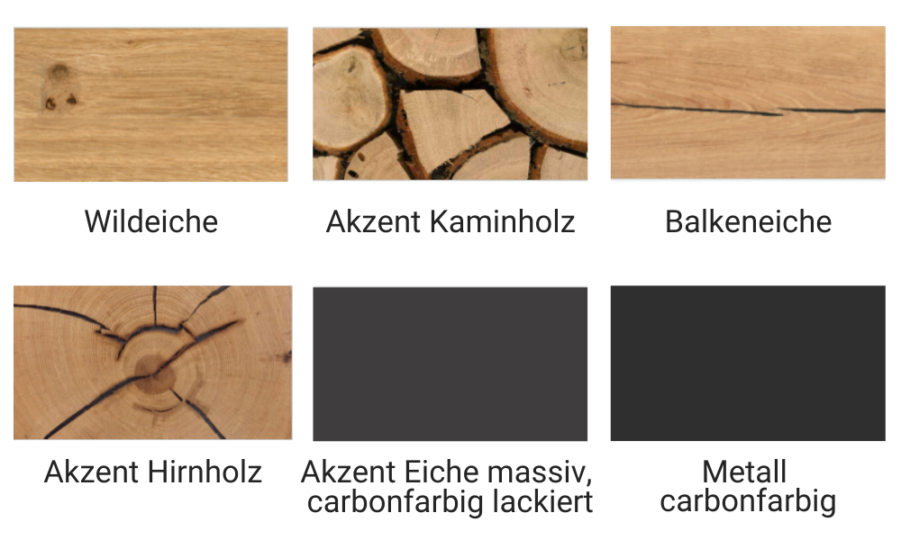 Die Tischplatten sind in vielen Farben erhältlich. Hier reicht das Farbspektrum von klassischer Eiche über Räucherlärche bis hin zur ausgefallenem Burned Wood.