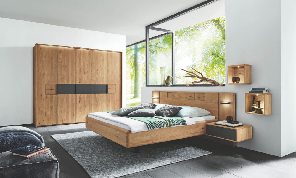 Hohe Gipfel und idyllische Täler mit urwüchsigen Bäumen – diese Atmosphäre einer beeindruckenden Landschaft zieht mit dem Modell WSM 1600 in Ihr Schlafzimmer ein. Zeitgemäße Farbakzente für Schrank und Bett schaffen dabei einen faszinierenden Kontrast zu natürlichen Ausdruckskraft der Massivhölzer.