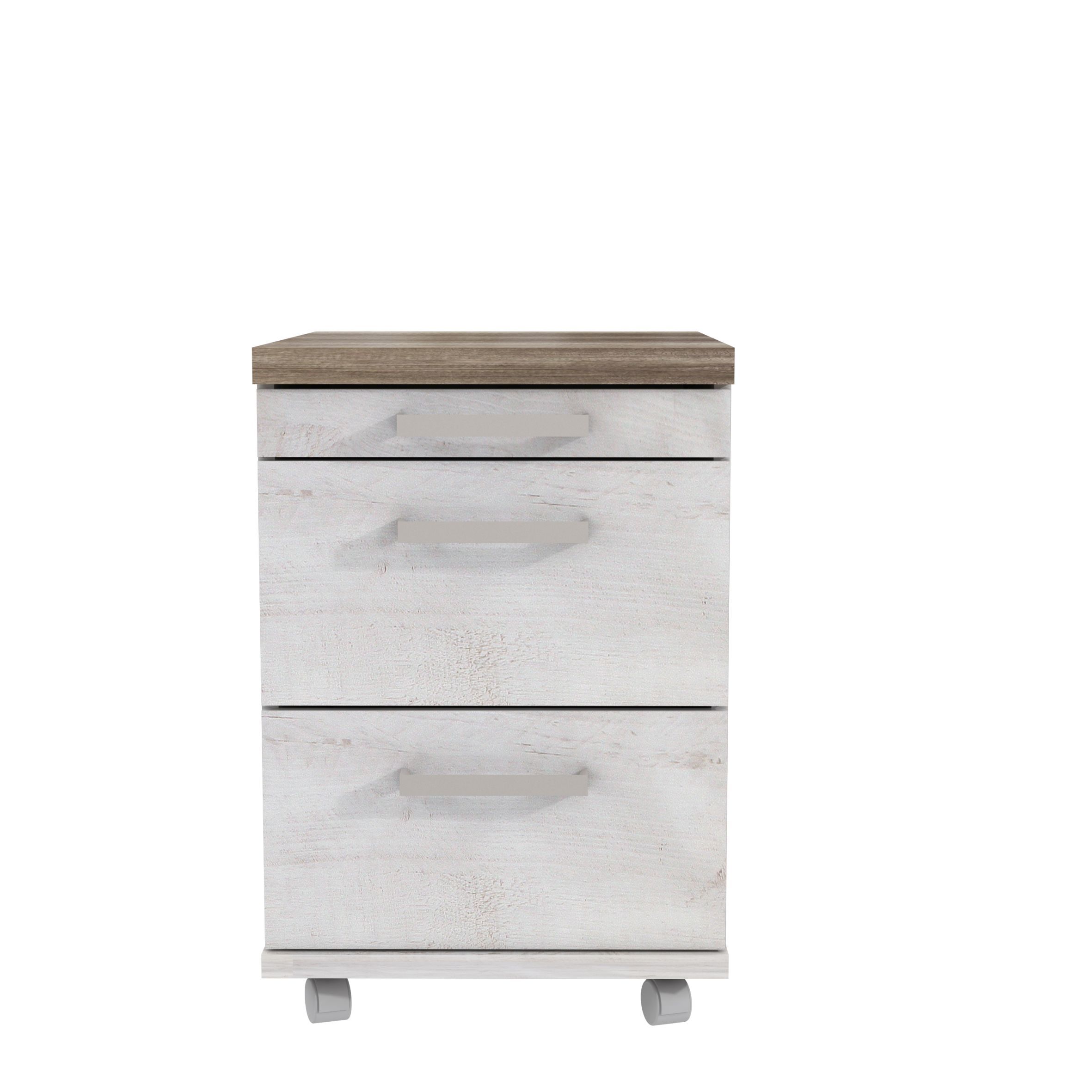 AusführungLichtweiß kombiniert mit SandgrauAusstattung3 SchubkästenLieferumfang1 Rollcontainerohne Dekoration / Schreibtisch / Stuhl
