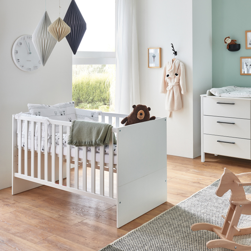 AusführungWeiß mit Absetzungen in AurumAusstattungmit Lattenrahmen3 Schlupfsprossen für einen einfachen Ein- und AusstiegLieferumfang1 Babybettohne Dekoration / weitere Möbel / Matratze