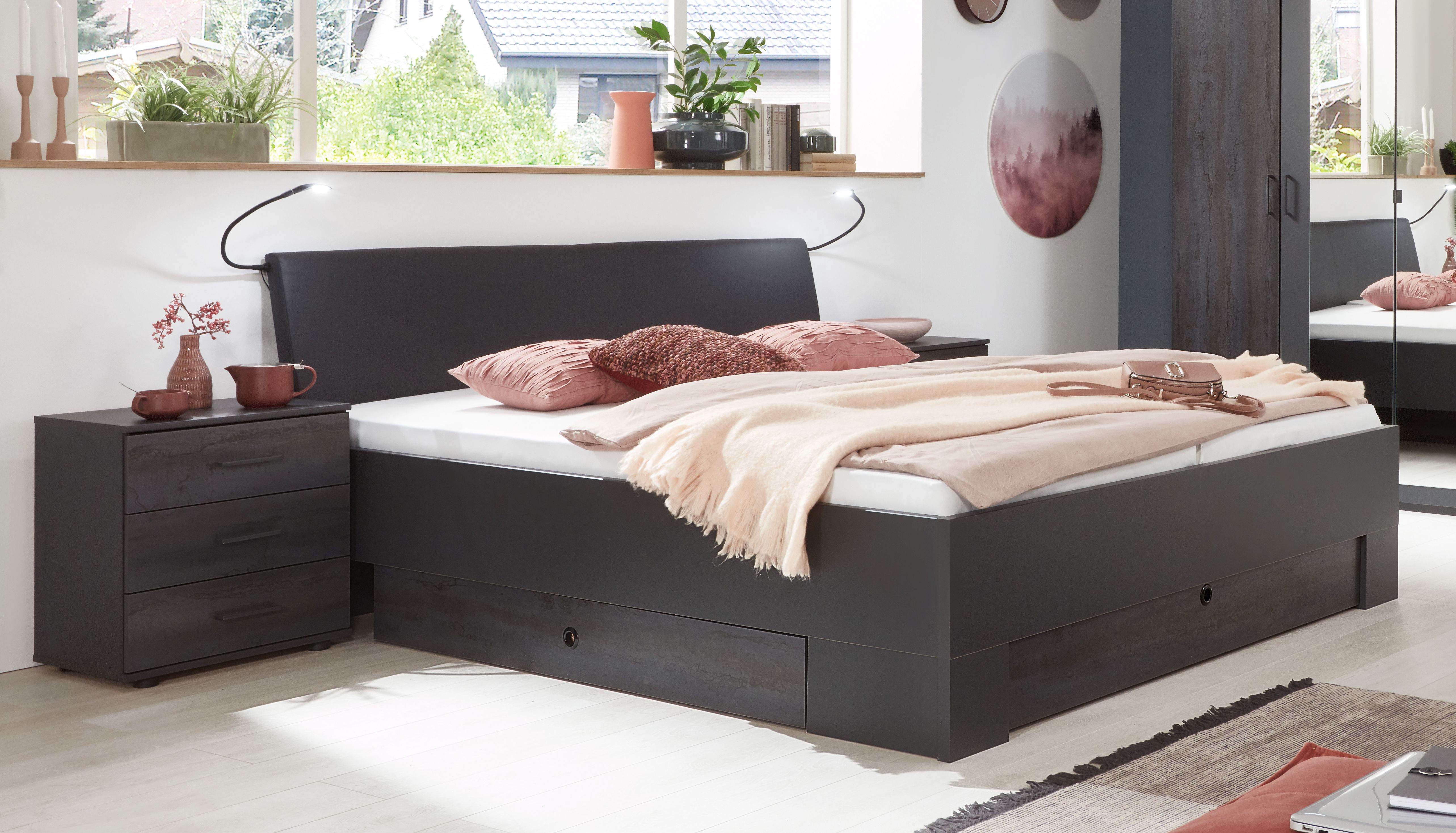 AusführungGraphit mit Absetzungen in Montana Eiche HolznachbildungAusstattung1 Bettgestell mit KopfteilKopfteil mit Beleuchtunginklusive 2 BettschubkästenLieferumfang1 Stauraumbettohne Dekoration / Lattenrost / Matratze
