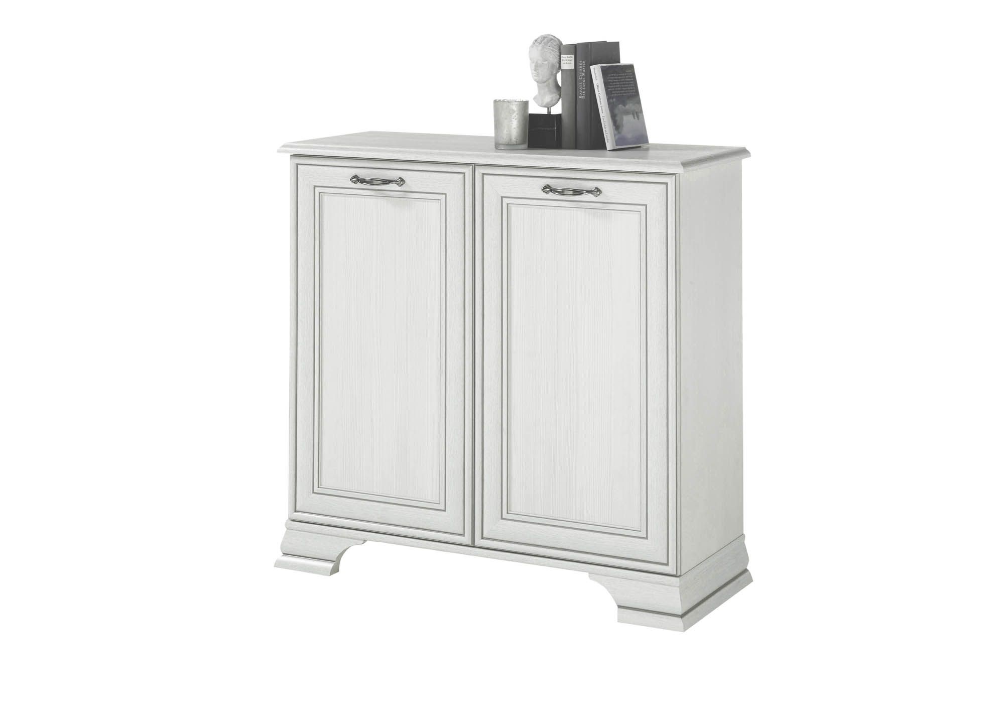 AusführungKorpus: Weiß, Spanplatte MelaminbeschichtungFront: Weiß, Spanplatte MelaminbeschichtungGriffe: Kunststoff in schwarzFüße: Kunststoff in grau, rundAusstattung2 Türen1 EinlegebodenLieferumfang1 Kommodeohne Dekoration / weitere Möbel