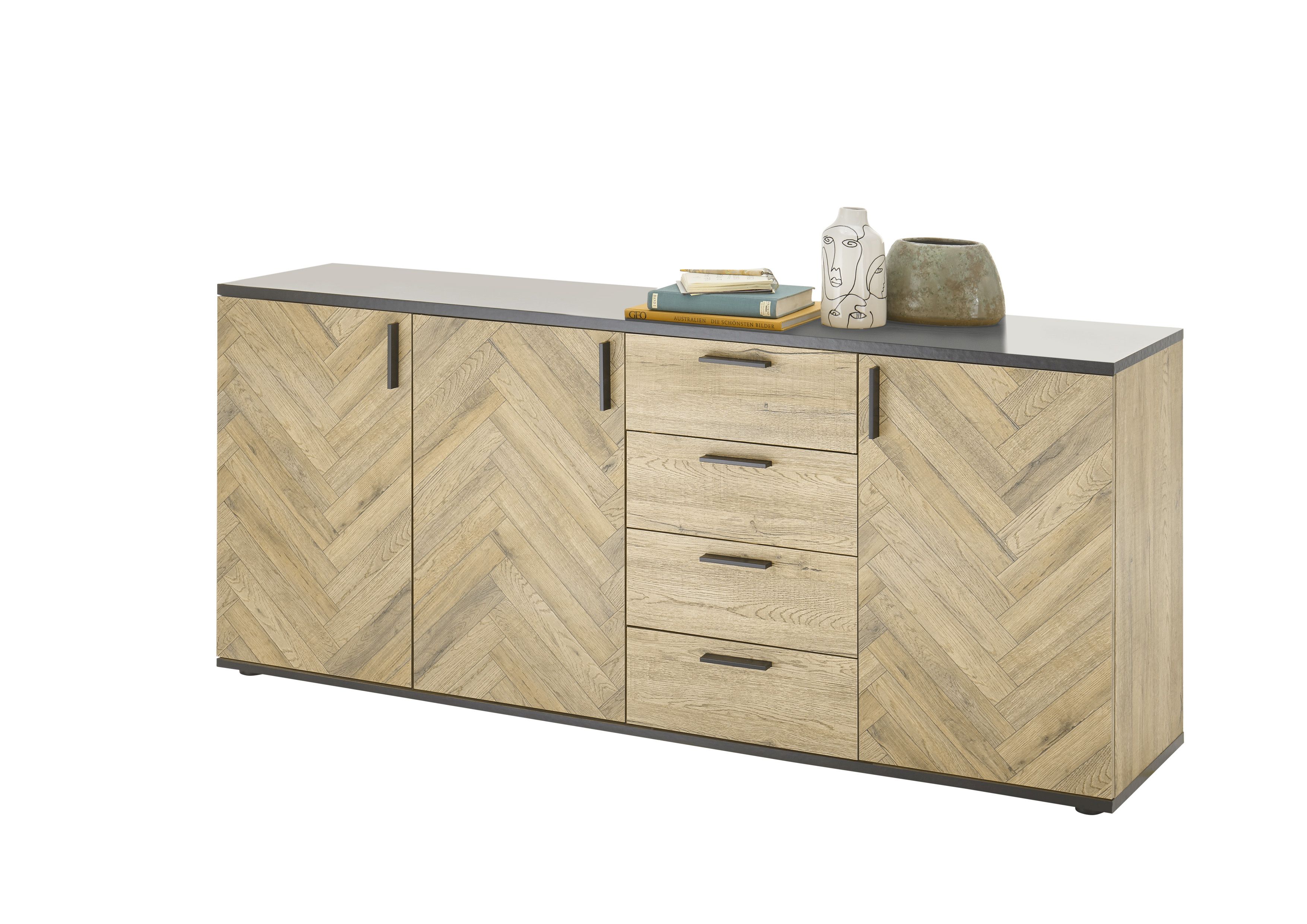AusführungKorpus: Artisan HolznachbildungFront: Schwarz kombiniert mit Absetzungen in Artisan HolznachbildungAusstattung2 Türen2 Fachböden4 SchubkästenLieferumfang1 Sideboardohne Dekoration / weitere Möbel